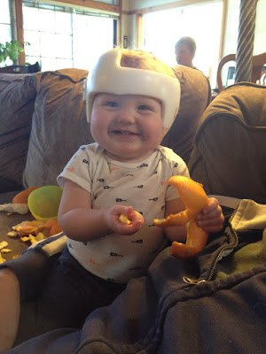 Eleven months brought the end of the DocBand, a new found love of the outdoors and balls and an increasing hatred of self-propelled movement. While his brothers are playing baseball and riding scooters down the driveway, Tyler is perfectly content to sit on the sidewalk and watch them. He loves to just sit and enjoy the fresh air. While inside, he doesn't last even one minute on the ground by himself. He is ever whining and crying to be picked up by mom. Not so outside. Outside he'll sit forever and just observe.